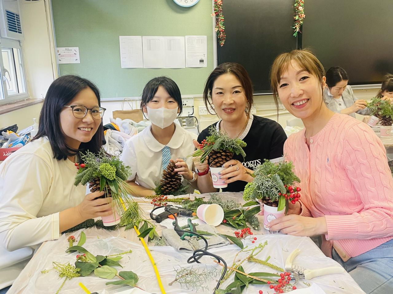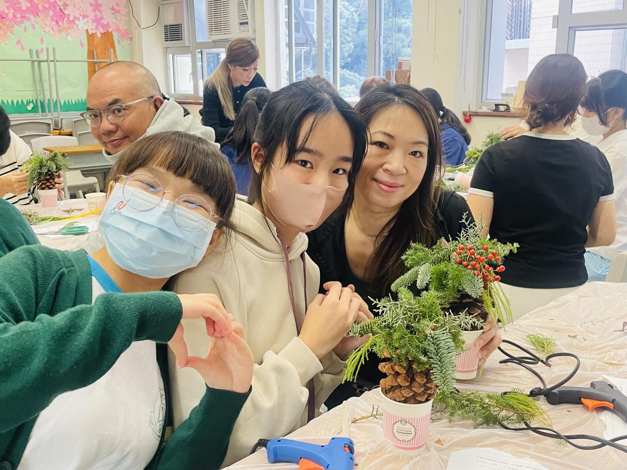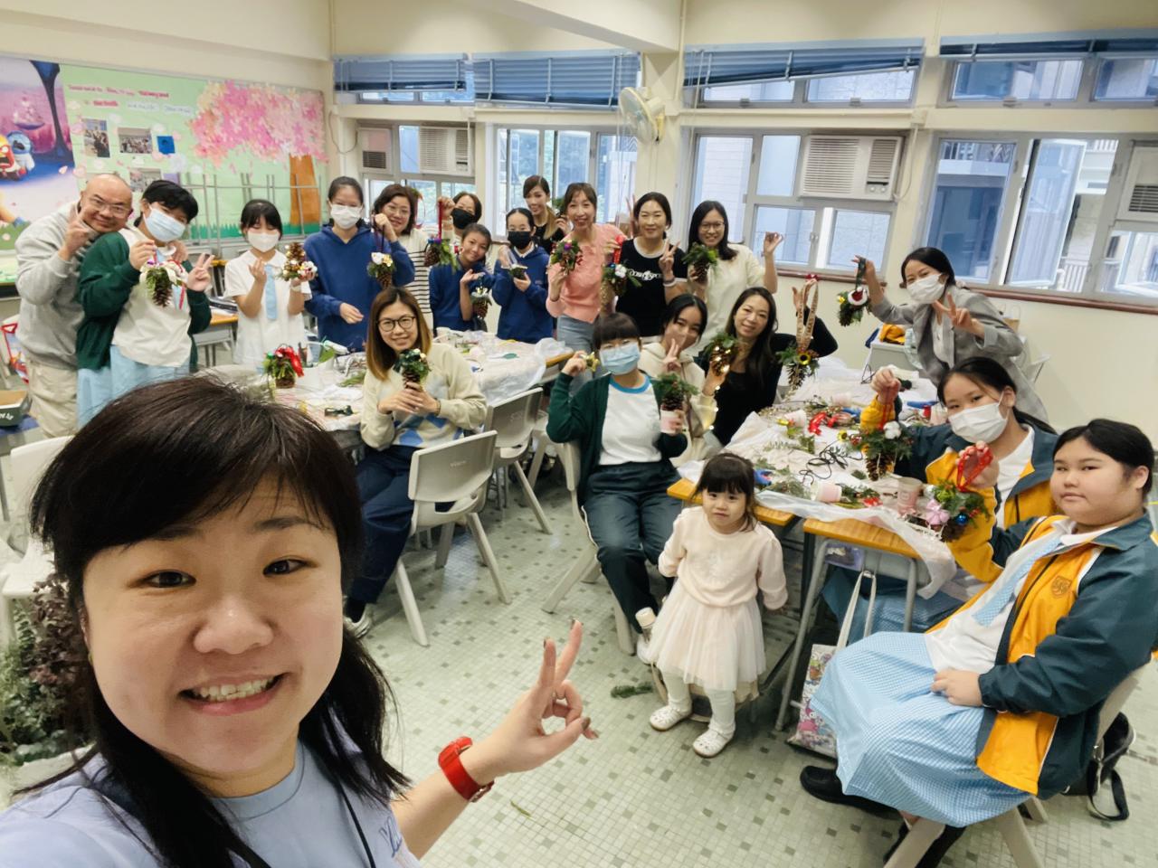 另外,每年都舉行的教師聖誕花環工作坊,今年以「Flower Jamming」形式進行,由於參加者大都在過去已參加類似工作坊,所以學校社工給予更大自由度,讓老師們運用所學過不同的花藝技巧完成作品。參與的家長和教職員在活動中都學到以參與園藝方式達到輕鬆紓壓目標,亦在過程中彼此關顧大家的工作和生活需要,從自己的創作中更欣賞自己。