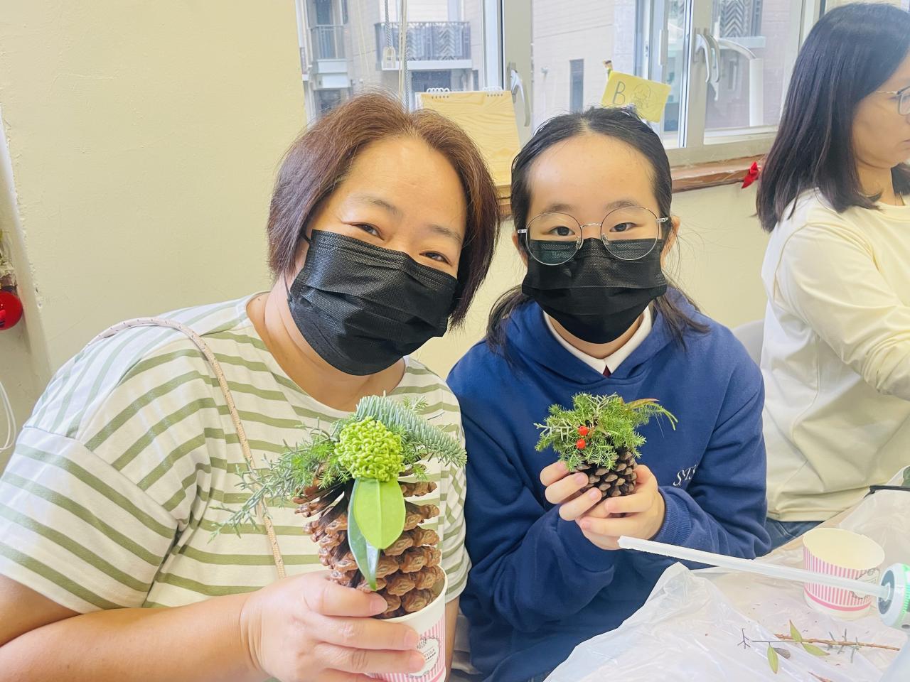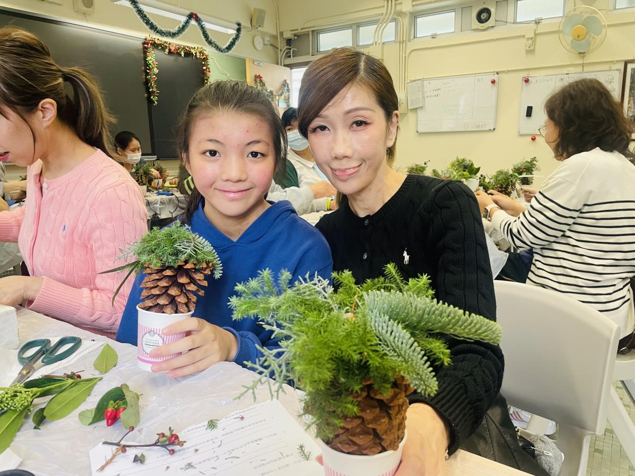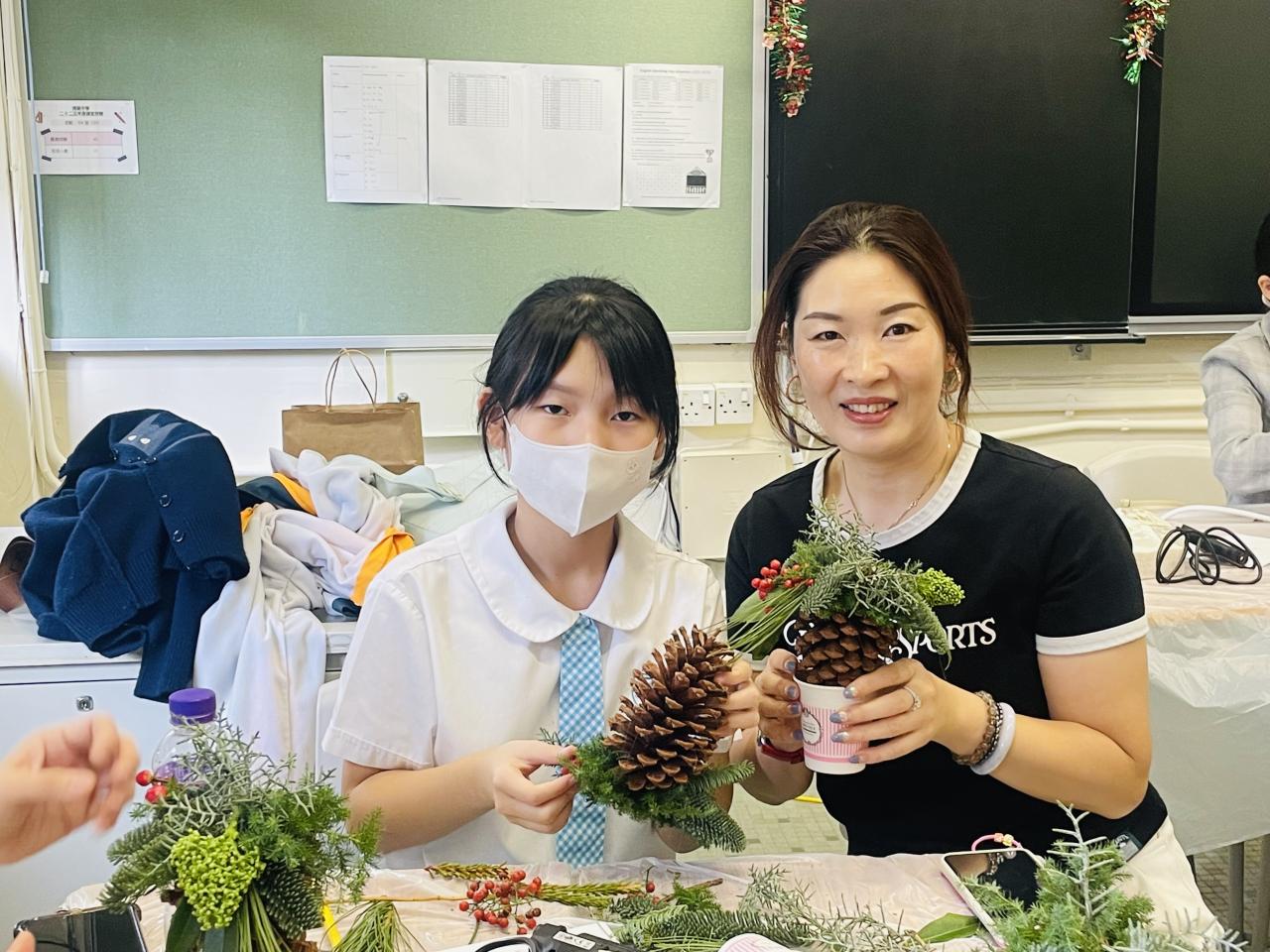 另外,每年都舉行的教師聖誕花環工作坊,今年以「Flower Jamming」形式進行,由於參加者大都在過去已參加類似工作坊,所以學校社工給予更大自由度,讓老師們運用所學過不同的花藝技巧完成作品。參與的家長和教職員在活動中都學到以參與園藝方式達到輕鬆紓壓目標,亦在過程中彼此關顧大家的工作和生活需要,從自己的創作中更欣賞自己。