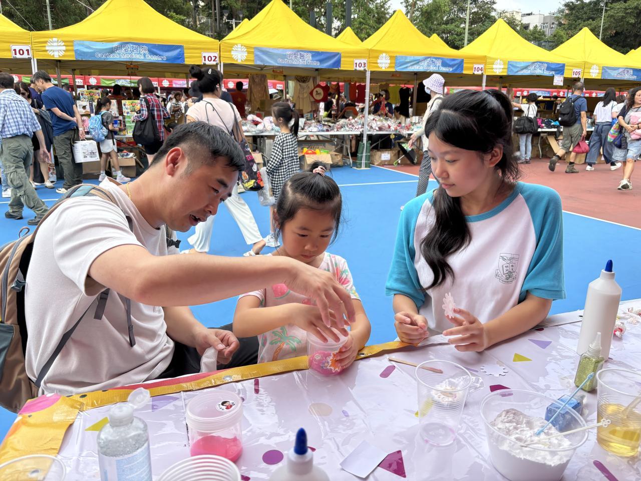 我校共設置了三個不同的攤位。第一個攤位是STEAM自製鬼口水的環節,讓參加者了解鬼口水的成分並參與製作過程,旨在激發他們的創意與學習興趣;第二個則是遊戲攤位,遊戲圍繞天主教的核心價值,讓居民在樂趣中對天主教各項價值有更深入的了解;第三個攤位是義賣攤位,我們出售了不同物品,所得善款用作支援有需要的群體。通過義賣,我們不僅提供了物品,傳遞了愛心和關懷的精神。