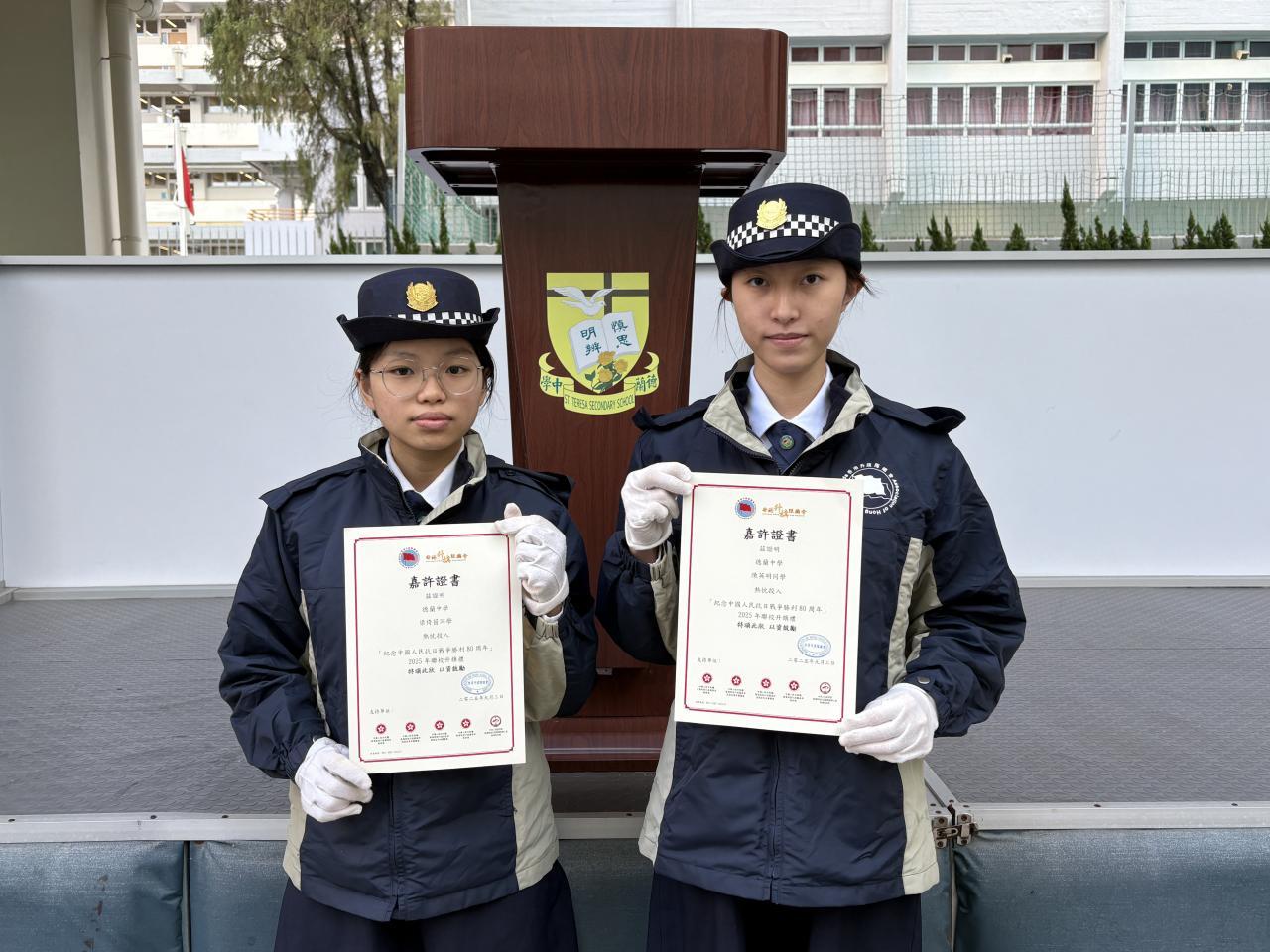 本校升旗隊參與香港升旗隊總會舉辦「紀念中國人民抗日戰爭勝利80周年」2025年聯校升旗禮,於2025年9月3日進行紀念中國人民抗日戰爭勝利80周年升旗禮,並在校園進行各項抗戰歷史學習活動(如:抗戰歷史展覽、誦唱抗戰歌曲等)。當天參與升旗禮的隊員包括:(六愛)周佳兒、鍾珈敏、(六悌)蘇嘉晞、(六忠)李翠芸、馬佳寧和林安淇同學;而(五愛)梁倚茵和(五孝)陳英明發表國旗下講話,獲發嘉許證書。本校整體表現優秀,獲頒「積極參與獎」獎盃。相關活動照片亦刊登於香港升旗隊總會《2025年紀念中國人民抗日戰爭勝利80周年聯校升旗禮特刊》。