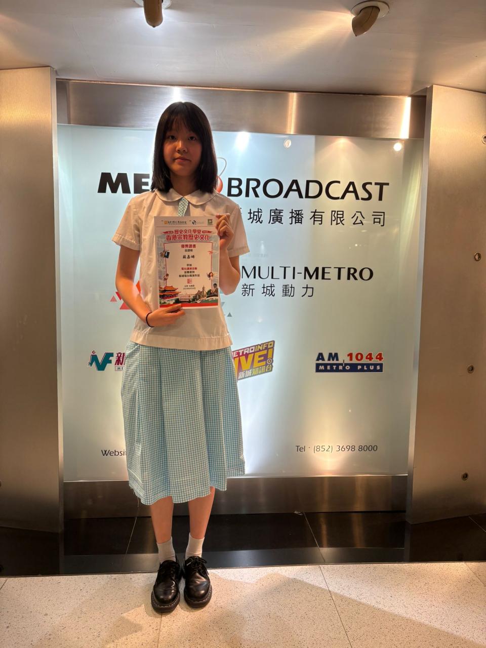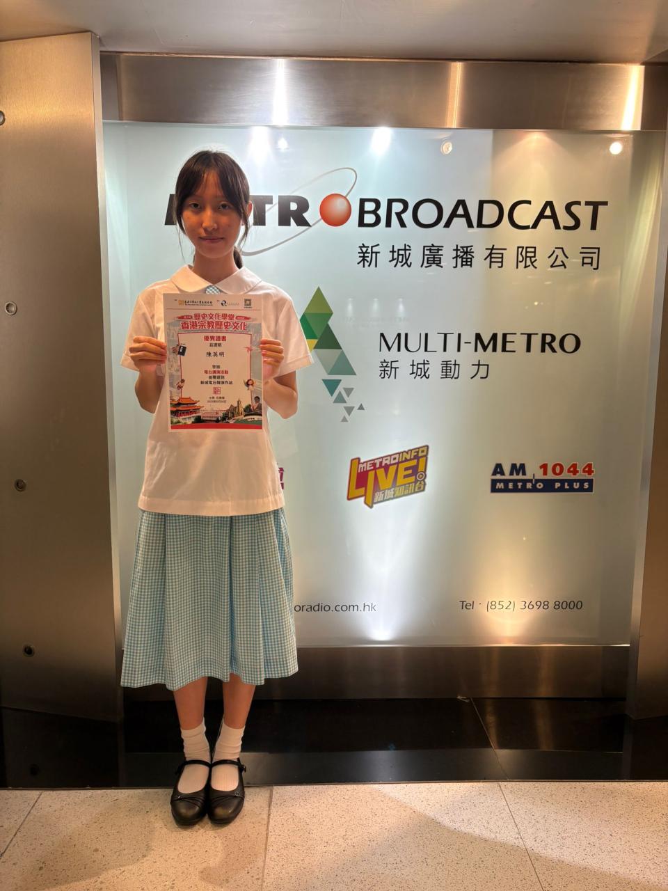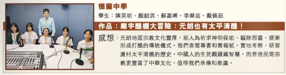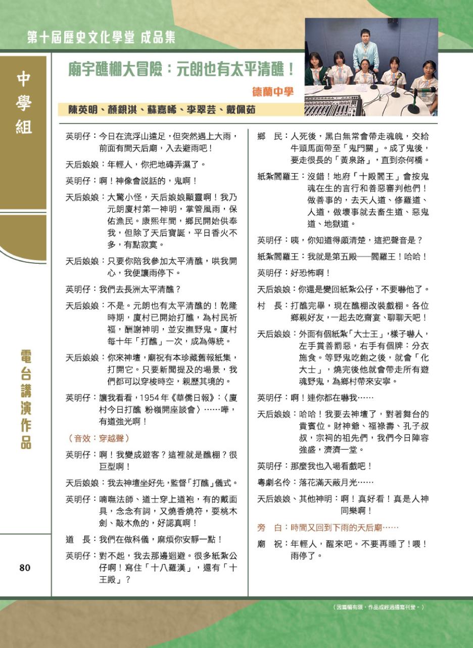 歷史科致力推動中華文化教育和香港歷史研究。科組早前推薦學生參與香港中華文化發展聯合會《歷史文化學堂(第十屆)——香港宗教歷史文化》電台講演比賽。(五孝)陳英明、顏鋇淇、(六悌)蘇嘉晞、(六忠)李翠芸、(三愛)戴佩茹同學製作「廟宇醮棚大冒險:元朗也有太平清醮!」的廣播劇,介紹廈村太平清醮的歷史,以及相關傳統習俗,奪得入圍獎。節目已於新城電台知訊台《世界隨意門》播出,《文路》雜誌第47期也有相關報導。此外,廣播劇之選段已收錄於文聯會《歷史文化學堂──香港宗教歷史文化 成品集》,供公眾和學界參考。