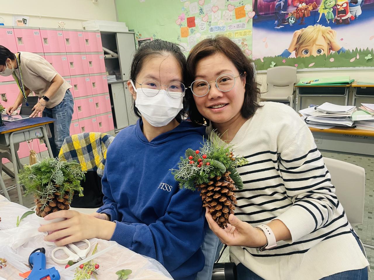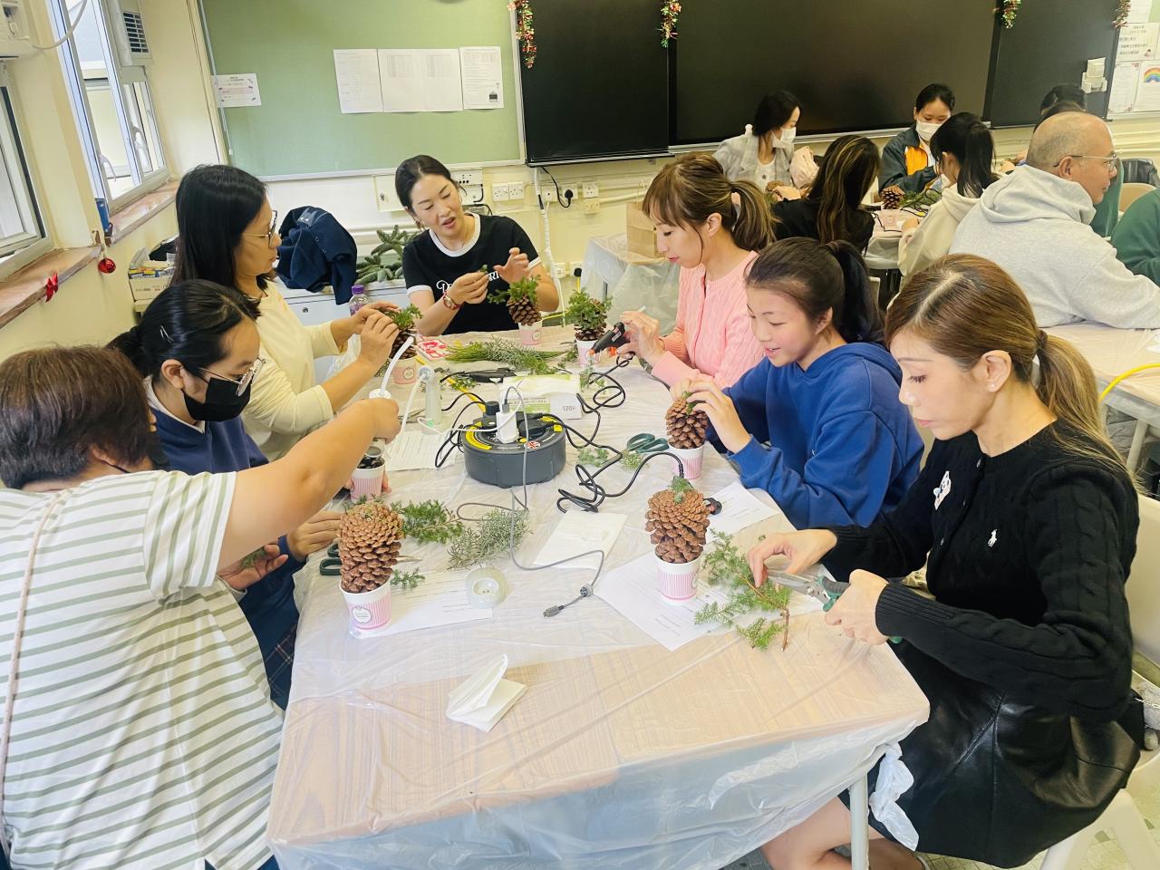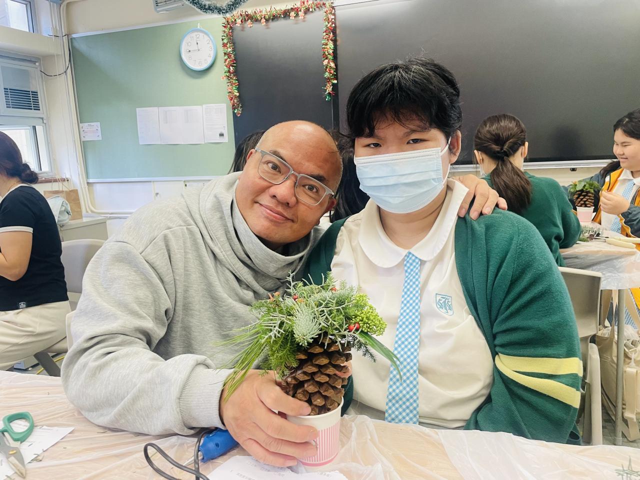 另外,每年都舉行的教師聖誕花環工作坊,今年以「Flower Jamming」形式進行,由於參加者大都在過去已參加類似工作坊,所以學校社工給予更大自由度,讓老師們運用所學過不同的花藝技巧完成作品。參與的家長和教職員在活動中都學到以參與園藝方式達到輕鬆紓壓目標,亦在過程中彼此關顧大家的工作和生活需要,從自己的創作中更欣賞自己。