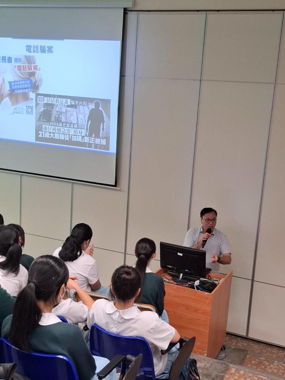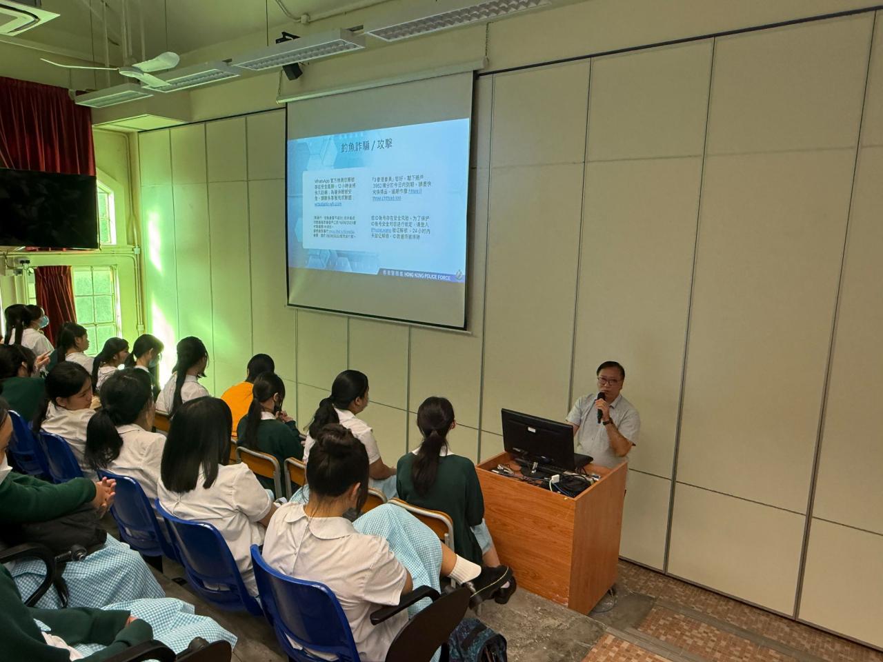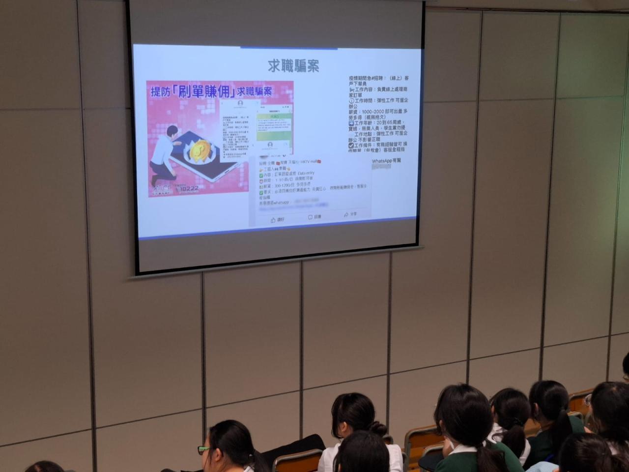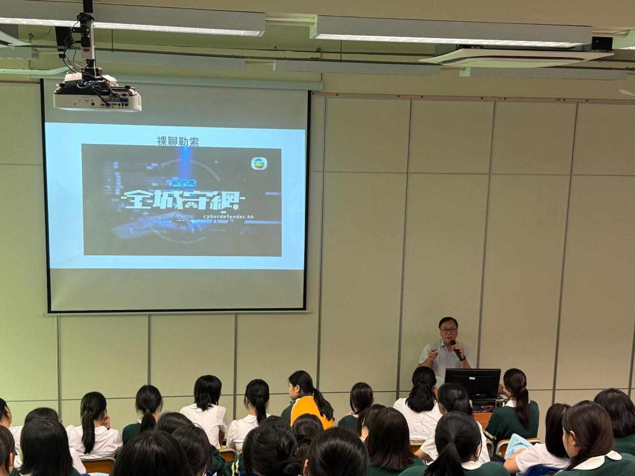 本校於10月3日邀請警民關係主任到校,為中四至中五級學生舉辦 「防罪講座」。希望透過講座內容,教導學生加強網絡安全的意識,提醒他們關注社交媒體的潛在危機和風險,免墮網絡陷阱,學習保障個人的私隱和安全。學生表現投入,並積極回答講者提問。