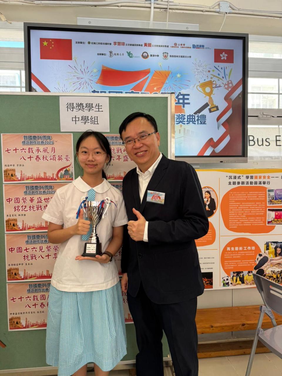 本校學生茅詩涵(四愛)參加由紅磡三約街坊福利會、李慧琼立法會議員辦事處、黃國立法會議員辦事處、工聯會九龍城地區服務處及九龍西辦事處、民建聯九龍城支部主辦的賀國慶76周年標語創作比賽2025,表現優異,榮獲亞軍。
