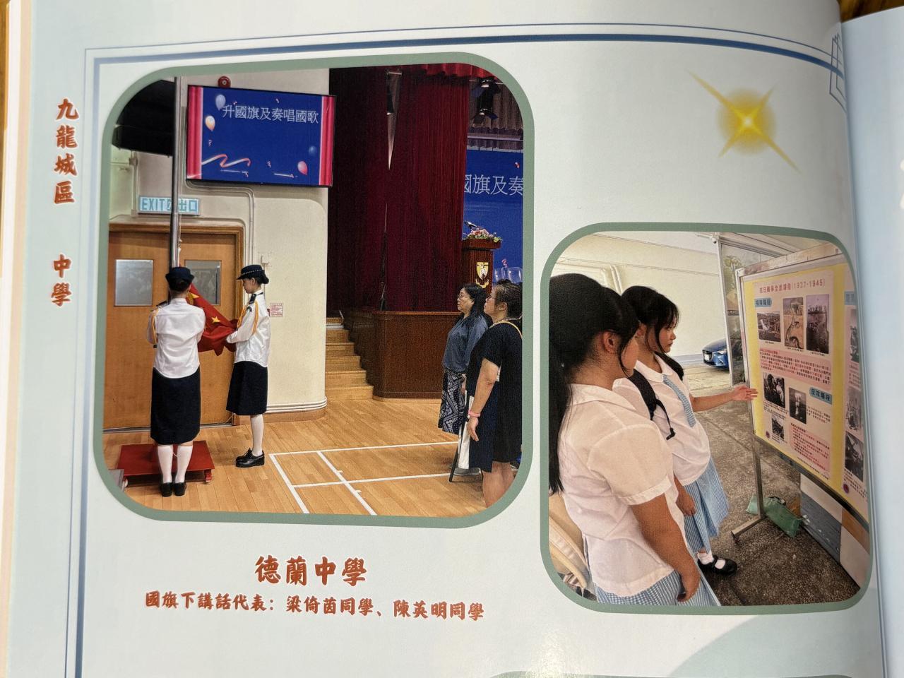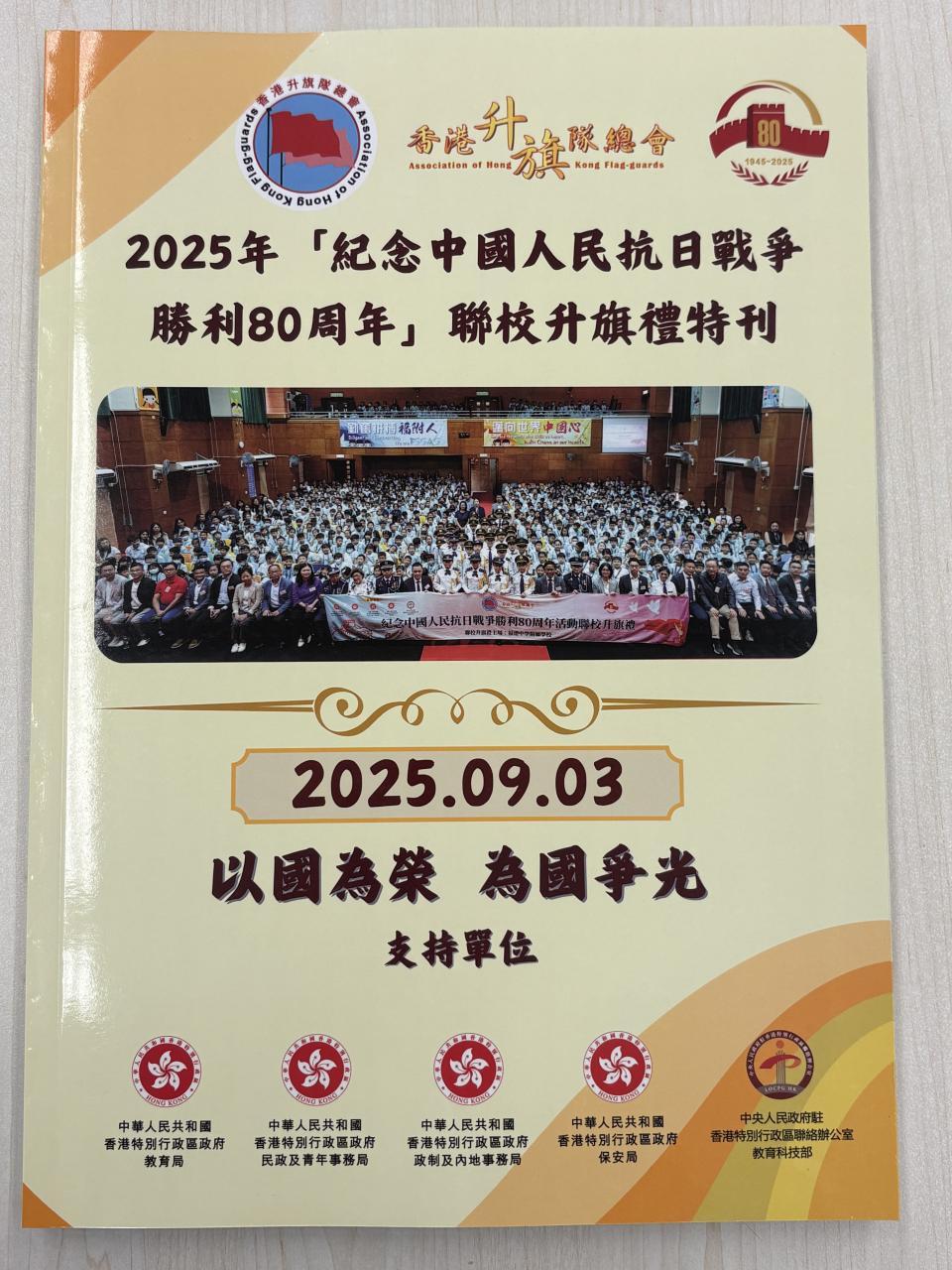 本校升旗隊參與香港升旗隊總會舉辦「紀念中國人民抗日戰爭勝利80周年」2025年聯校升旗禮,於2025年9月3日進行紀念中國人民抗日戰爭勝利80周年升旗禮,並在校園進行各項抗戰歷史學習活動(如:抗戰歷史展覽、誦唱抗戰歌曲等)。當天參與升旗禮的隊員包括:(六愛)周佳兒、鍾珈敏、(六悌)蘇嘉晞、(六忠)李翠芸、馬佳寧和林安淇同學;而(五愛)梁倚茵和(五孝)陳英明發表國旗下講話,獲發嘉許證書。本校整體表現優秀,獲頒「積極參與獎」獎盃。相關活動照片亦刊登於香港升旗隊總會《2025年紀念中國人民抗日戰爭勝利80周年聯校升旗禮特刊》。