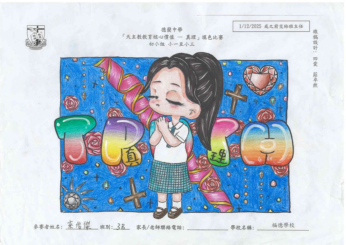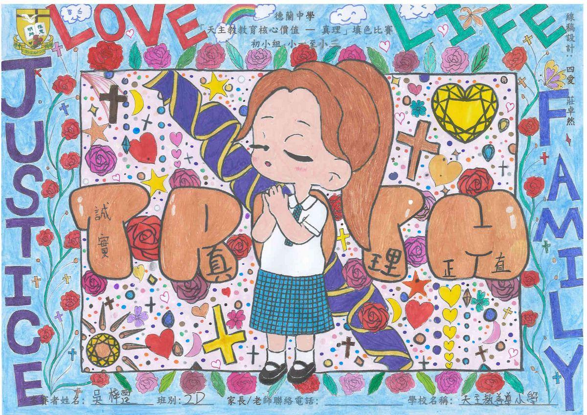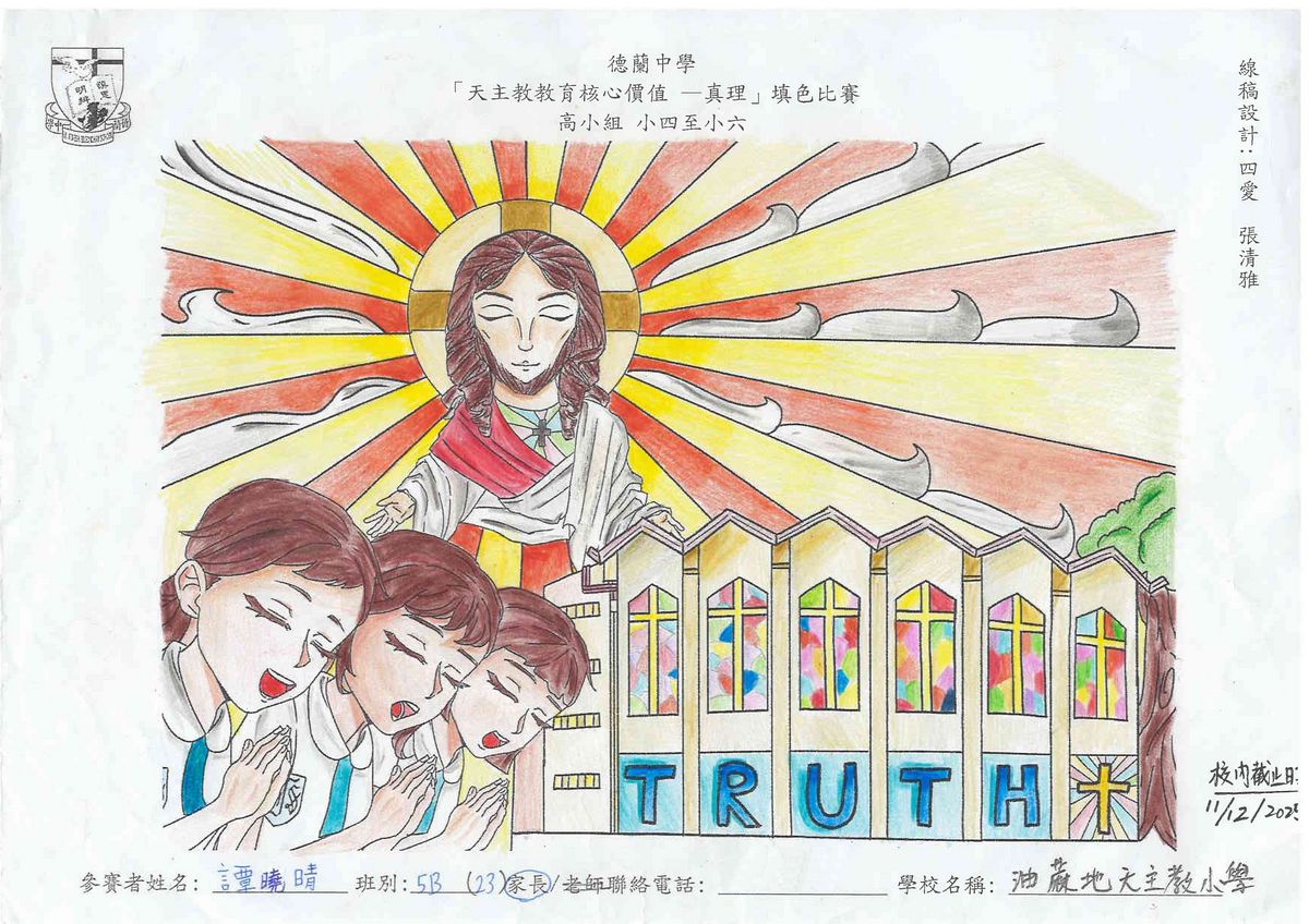 本校舉辦的「天主教教育核心價值 - 真理」填色比賽已圓滿結束!此次比賽旨在鼓勵學生展現他們的藝術創意和才能,並推廣本年度核心價值 - 真理這一重要價值觀。