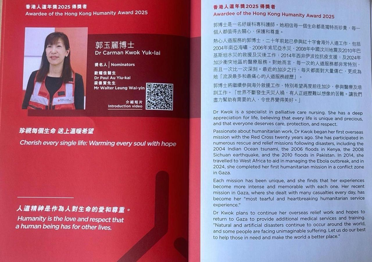 自2004年起,郭博士積極投身香港紅十字會義務護士工作,參與多項國際人道救援任務,包括2004年南亞海嘯、2006年肯尼亞水災、2008年中國汶川地震、2010年巴基斯坦水災、2014年西非伊波拉抗疫支援,以及2024年前往加沙衝突地區提供醫療服務。每一次任務,皆見證她對生命的尊重與堅持,即使面對傷痛與危難,仍以勇氣與同理心堅守前線。郭博士曾言,每一次人道服務皆深刻難忘,而最近的加沙之行,更成為她「流淚最多和最痛心的人道服務經歷」,卻也堅定了她繼續為世界播種希望的信念。
